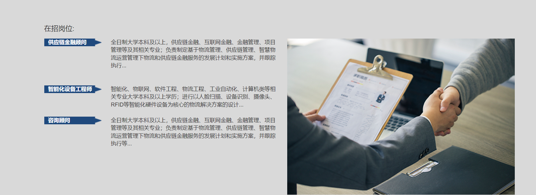 我们需要的人才专业包括不限于产业经济、工商管理、企业管理、投资管理、市场营销、客户服务、电子商务、物流和供应链管理、物流和供应链金融、 物流管理、物流工程、智能化、电子工程、计算机与信息技术、IOT 、云计算、大数据、系统集成等。